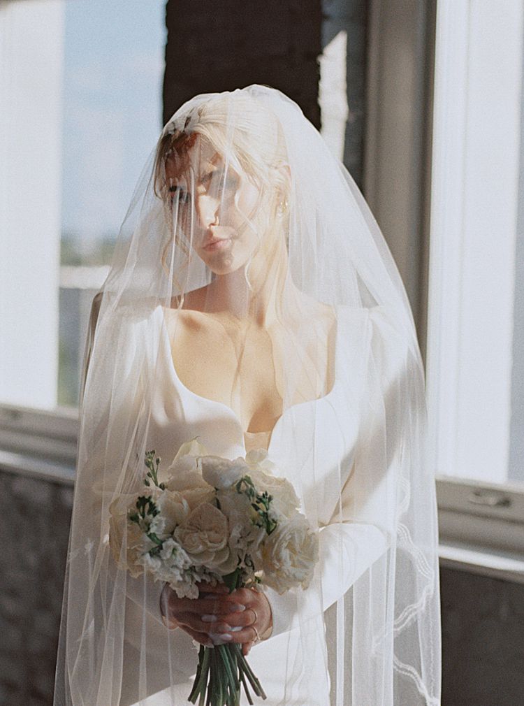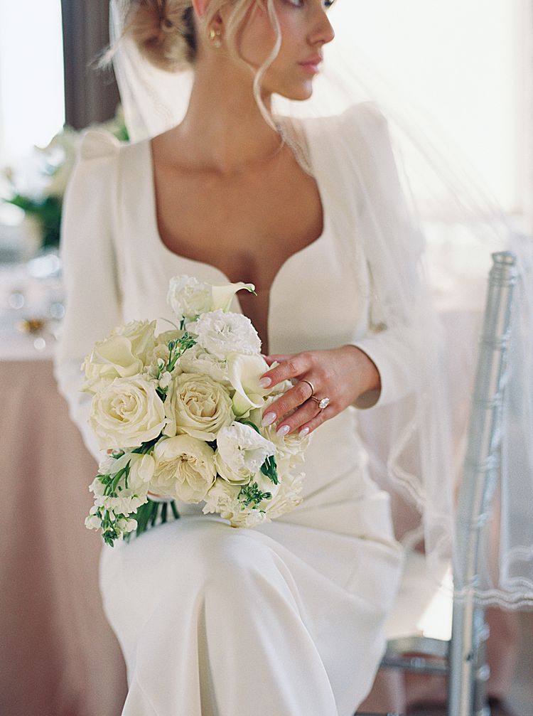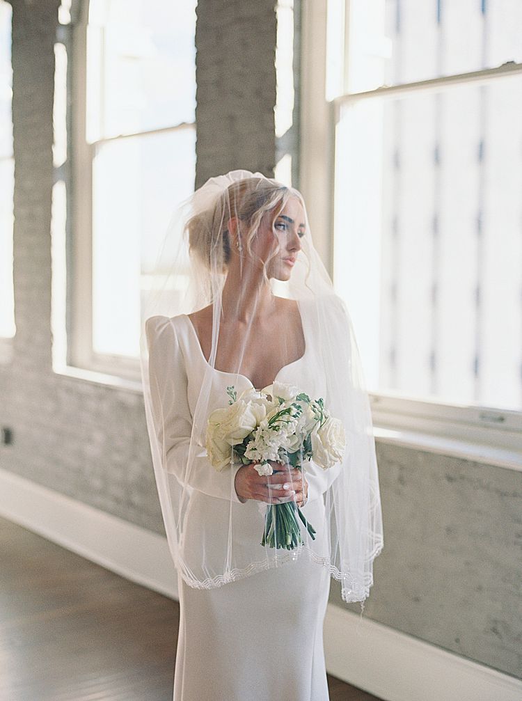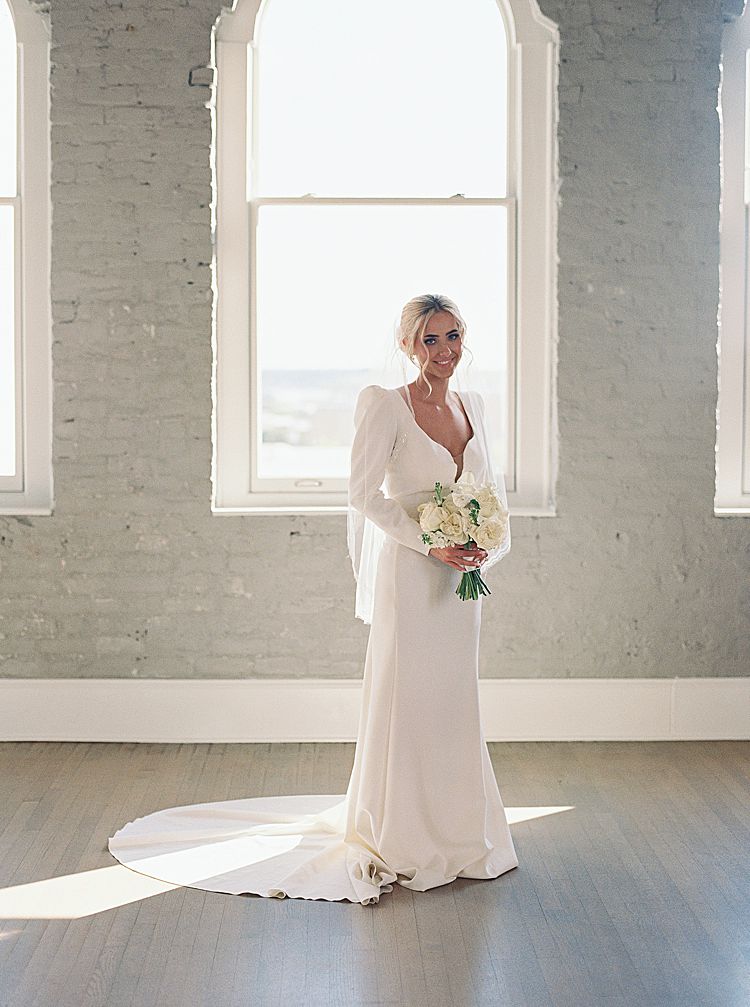 Reese looked radiant in her modern white gown from Lace Bridal. Its clean lines and sleek silhouette complemented the venue’s contemporary feel. She carried a lush bouquet by Florals by Brittany, adding a touch of classic romance. The florals paired beautifully with the minimalist styling, giving the session a refined, timeless edge.