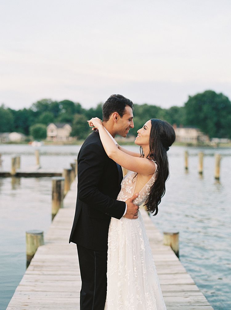 Their outdoor ceremony overlooking the Thompson Creek was a showstopper. It consisted of a floral arch framing the shoreline, and golden sunlight filtering through the trees. As a Maryland wedding photographer, moments like Jillian walking down the aisle and Max’s reaction make waterfront weddings so special.